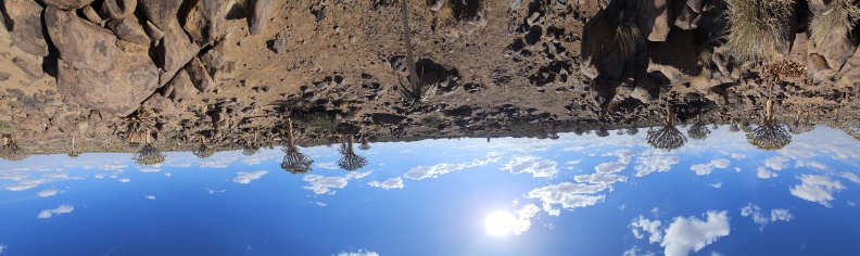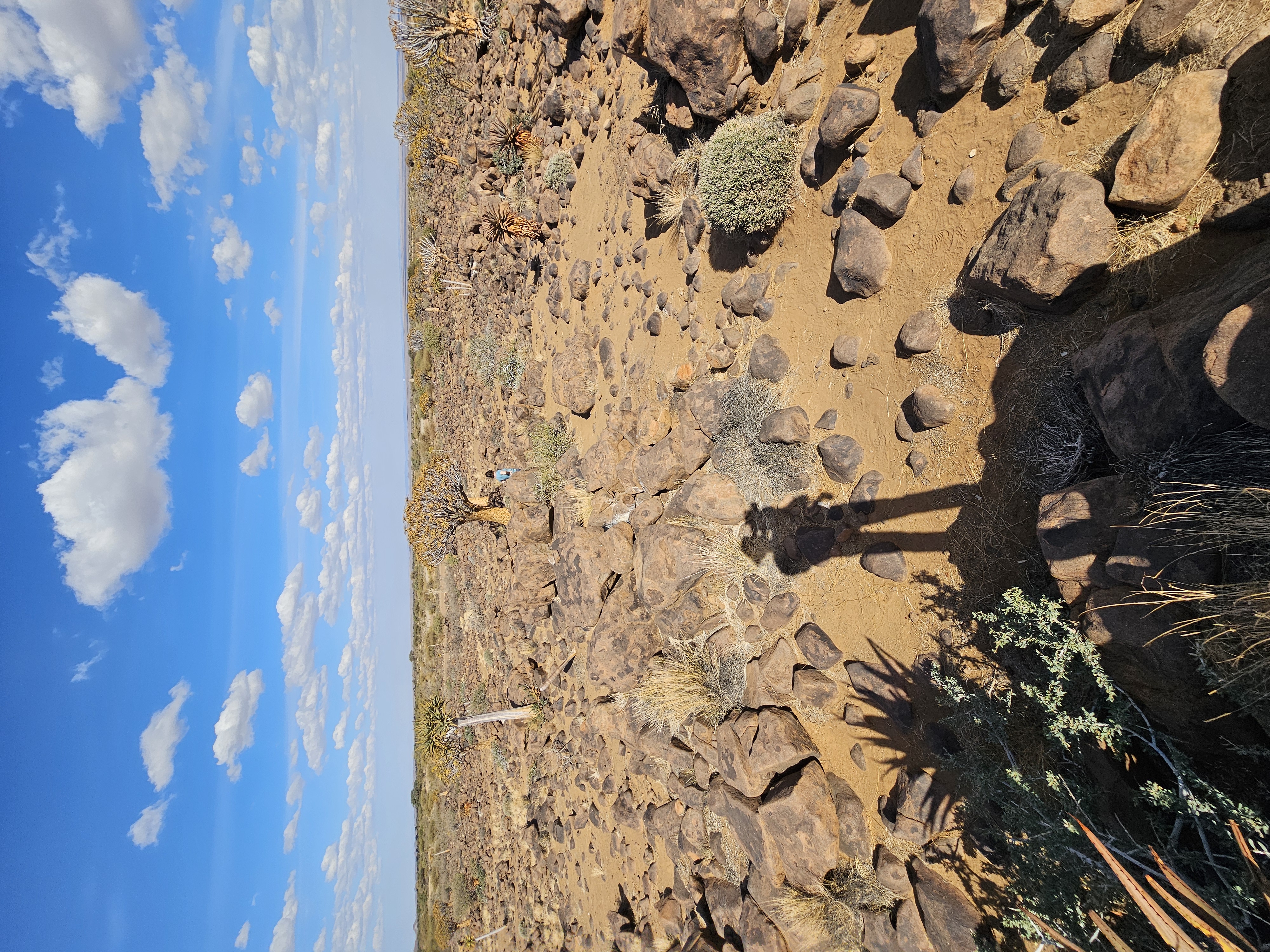 A rocky desert landscape with sparse vegetation under a bright blue sky dotted with clouds, showing a person's shadow on the ground.